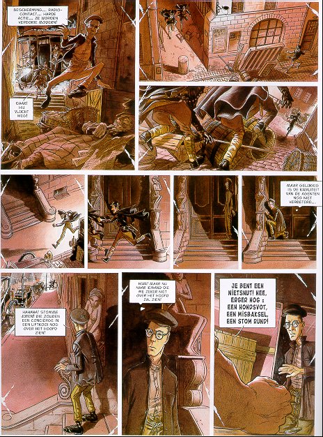| Info: | Het vlindernetwerk, een ondergrondse organisatie van dieven en inbrekers, heeft een geduchte replitatie en dat is niet zo vreemd, want iedereen die zich niet aan de beroepscodes houdt wordt geducht afgestraft. Twee leden van het netwerk komen er tijdens een inbraak bij toeval achter dat baron van Harcourt, een van de notabelen van de stad, een smerig spelletje speelt. Op een van de baron gestolen filmrol is te zien hoe hoertjes gedwongen worden mee te doen aan perverse en hardhandige sexspelletjes, die zeer slecht voor hen aflopen. In een zeer sfeervol door Cecil in beeld gebrachte negentiende eeuws decor gaat het tweetal op zoek naar de makers van de films. Daarbij moeten ze het niet alleen opnemen tegen de baron en zijn handlangers, maar ook tegen de corrupte politie! 48 blz groot formaat Door: Cecil / Corbeyran Prijs: fl. 13,95 / 280 Bfr. |