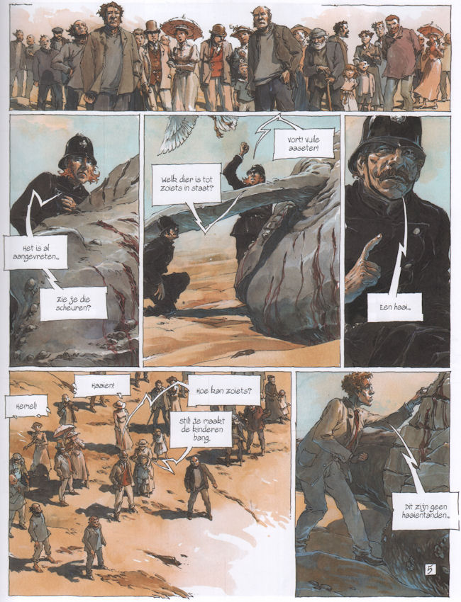 | Info: | - Het geweld... De kracht van de slagen... - De vorm van de afdrukken... - Voor mij is het duidelijk. - Het echtpaar Gower werd vertrappeld... door meerdere paarden. - Wat zegt u, dokter?! - Ze zijn letterlijk verpletterd in hun bed. Een dorpje aan de kust van Wales valt ten prooi aan een reeks onverklaarbare misdaden. Overdag schijnt de zon over dit pittoreske kustplaatsje, maar 's nachts breekt de hel los. Welk monster houdt zich schuil in het donker? Wie wordt het volgende slachtoffer? Welk bovennatuurlijk onheil staat het ooit zo vredige dorpje nu weer te wachten? Deze strip is een fascinerende kijk op de mogelijkheden die het medium biedt om angst op te roepen. Een uitdaging die Guillaume Sorel met brio aangaat. |