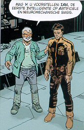 |  Ian - deel 1: De Elektrische Aap Het verhaal speelt zich af in het jaar 2044 en gaat over Ian. Ian weet dat hij niet hetzelfde is als de mens, de mens heeft hem gecreëerd. Hij is een soort mens, maar eigenlijk een robot en dan ook nog delen van en aap. Gelukkig kan je dat niet zien aan de buitenkant, hij ziet er hetzelfde uit als iedere andere man. En hij heeft ook gevoelens en emoties, maar of dat de bedoeling was van zijn makers? Hij wordt nu misschien wel te veel mens. De enige oplossing is om hem mee te laten werken op missies en te kijken wat er met Ian gebeurt. Het verhaal speelt zich natuurlijk in de toekomst maar gelukkig wel geloofwaardig. Het is een verhaal met veel informatie en veel dingen om te zien. Zal het later echt zo gaan??? Je kunt dit je wel voorstellen ja!!!! De tekeningen wel mooi maar erg somber ingekleurd, maar dat past misschien weer goed bij het verhaal. Een strip voor degene die zich interesseren voor de toekomst en hoe het er dan eventueel aan toe gaat. |