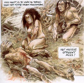 |  Het Meisje en de Wind (Collectie Buitengewesten) Het eerste verhaal uit de Collectie Buitengewesten. Het meisje Soen-Li is de dochter van de Grote Moeder die regeert over de lesbische, mannenhatende en mannenminachtende stad Bao-king. Oke, dit schrikt af, maar dit is het hele verhaal in het heel, heel kort. De tekeningen zijn vaag en onduidelijk, sober en onnatuurlijk, en toch begin ik aan deel 2. Waarom?? Waarschijnlijk omdat Soen-Li een beetje menselijk wordt. Ze begint te houden van een man uit de Barbaarse stam de Globs. Ze gaat zelfs voor hem strijden. Het wordt dus nog spannend ook!