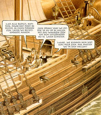 |  De Vliegende Hollander - Overture Tja, hoe moet ik hier mee beginnen. Dit is namelijk de eerste strip die ik heb gelezen, zelf uitgelezen maar nog steeds niks aanvond. Begrijp me goed, dit betekend niet dat ik de strips niet lees, maar dat ik met deze erg veel moeite had. Meestal als een strip me niet bevalt leg ik hem gelijk al weg. Het verhaal speelt zich af in de 16e en 17e eeuw. De eeuwen waarin de scheepvaart een belangrijke rol speelden. En daar wilde Jack wel een spannend verhaal bij maken. Ik vind dat dat niet is gelukt. Het is veel te langdradig en op het moment dat het "spannend" wordt gebeurd er erg weinig en is het erg vaag.