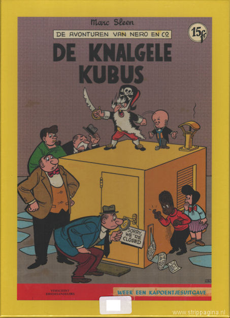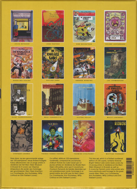 | Info: | Deze doos, op een genummerde oplage van 150 exemplaren, bevat fictieve Knalgele Kubus albumcovers van 13 jonge artists in residence van het Marc Sleen Museum in Brussel én 4 covers van Vlaamse stripauteurs die eerder een hommage aan grootmeester Marc Sleen brachten: Luc Cromheecke, Kim Duchateau, Willy Linthout en Dirk Stallaert (cover) |