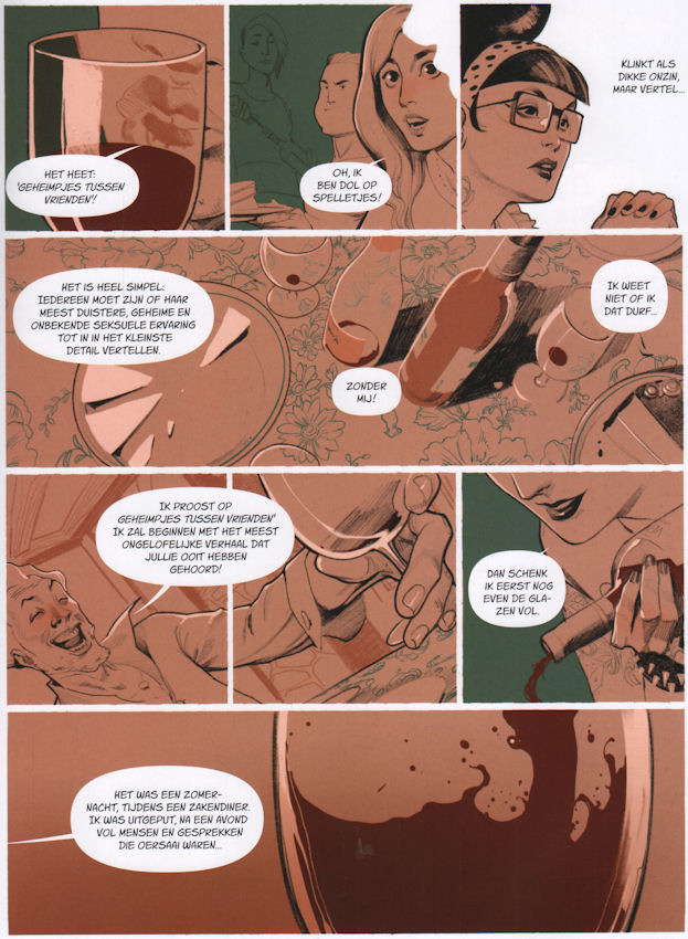 | Info: | Wanneer de roes geheimen losweekt, harten op hol laat slaan en lichamen in beweging zet binnen een vriendengroep... Alles begint met een onschuldig drankspelletje tijdens oud en nieuw, waarin iedereen zijn meest geheime seksuele avontuur onthult. Naarmate de ontboezemingen brutaler worden, herkennen sommigen zich in de verhalen, anderen lachen, verbazen zich, worden boos... en de spanning stijgt sneller dan de wijn naar het hoofd. Ontrouw, verraad, onuitgesproken verlangens, je zou versteld staan van wat je vrienden allemaal verzwijgen! In Vino Veritas is een verhaal dat tegelijk zintuiglijk en intiem is. Met een stijl die schakelt tussen strakke lijnen en grafische uitspattingen nemen ze ons mee op een bevrijdende reis vol overgave en de aanvaarding van zelfs onze diepst weggestopte fantasieën. |
